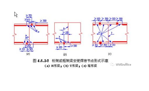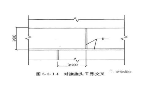 5.6.1 4 要求焊縫與母材等強(qiáng)和承受動(dòng)荷載的對(duì)接接頭,其縱橫兩方向的對(duì)接縫,宜采用T形交叉,交叉點(diǎn)的距離不宜小于200mm,且拼接料的長度和寬度不宜小于300mm,如有特殊要求,施工圖應(yīng)注明焊縫的位置。